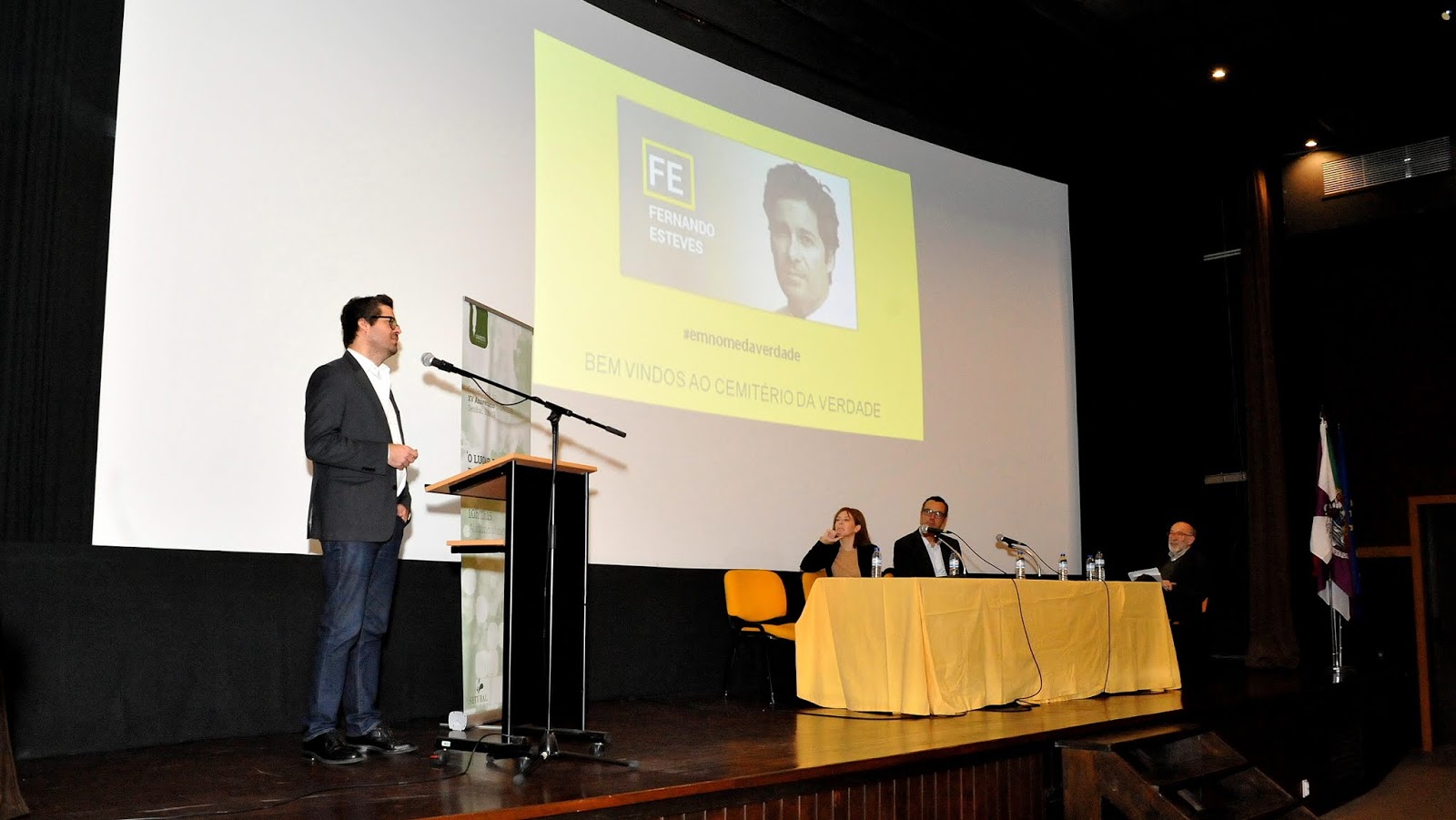 Entrando propriamente no tema da palestra disse que o mundo verdadeiro nunca existiu. Há certas notícias falsas que duram para sempre, sempre houve manipulações e o Homo Sapiens foi o criador da pós-verdade, usando as redes sociais humanas que antecederam as redes digitais.